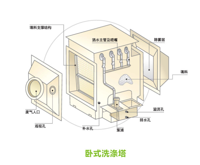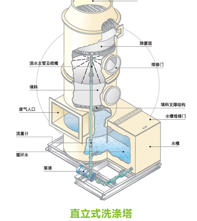 填充床式洗滌塔處理原理是在循環(huán)水中注入藥液,并于洗滌塔內(nèi)噴灑至酸/堿氣體中,將酸/堿氣體中的物質(zhì)中和洗滌,并溶于循環(huán)水中,循環(huán)水排入排入水槽中再經(jīng)循環(huán)泵打入洗滌塔內(nèi),循環(huán)持續(xù)中和的過程;當(dāng)循環(huán)水導(dǎo)電度升高到一定程度,表示循環(huán)水溶入太多污染物,需經(jīng)系統(tǒng)進(jìn)行更換并重新調(diào)整循環(huán)水的藥液用量,以持續(xù)進(jìn)行廢氣處理。...