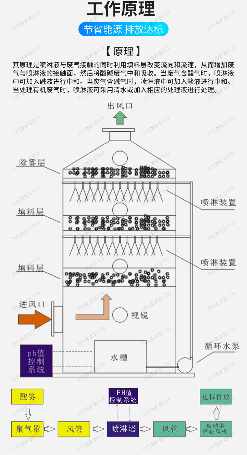 噴淋塔廢氣設(shè)備操作方便、便于安裝檢修、強(qiáng)度高、使用壽命長、占地面積小,是當(dāng)前理想的高濃度酸堿廢氣處理設(shè)備。