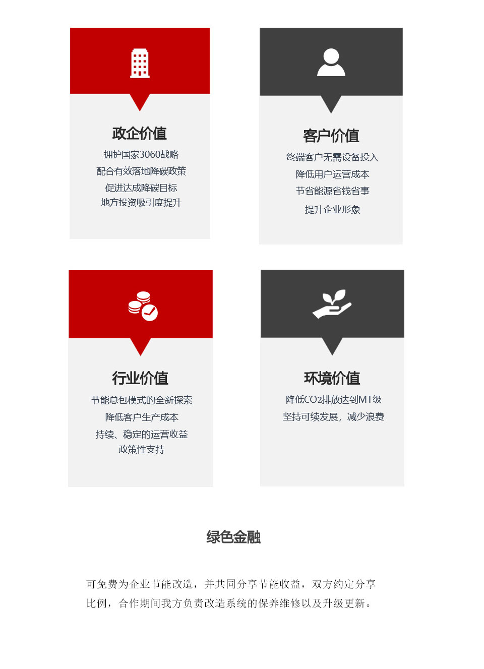 通過(guò)合同能源管理的模式或其他節(jié)能變現(xiàn)的方 式幫助企業(yè)實(shí)現(xiàn)前期零投資